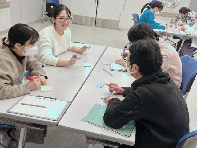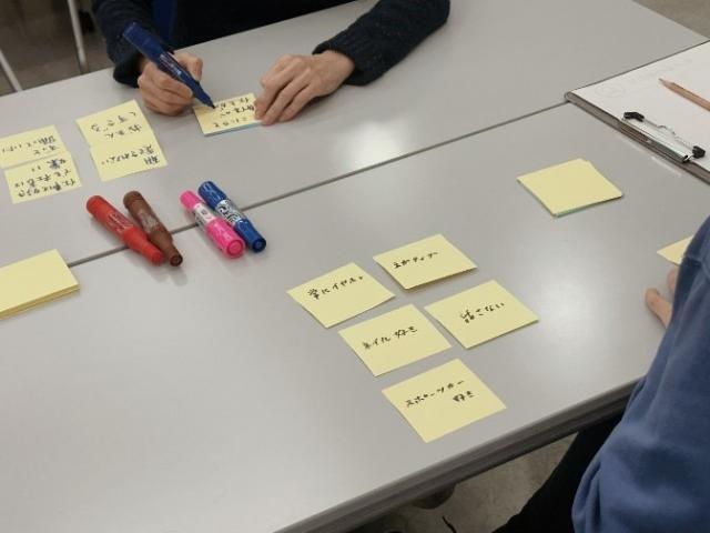 それぞれが「自分の活動や生活でひっかかっていること」を書き出します。そしてそれをグループで共有。「一度くらい結婚してみたい!」や「自分のことがわからない」、「しゃべりすぎる」などいろいろな「わたしのひっかかっていること」が出てきました。「わかる~」や「こうするといいよ!」などの声が飛び交いました。これがワークショップを作る基礎となります。