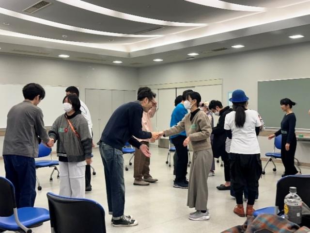 ワークの1個目は好きな食べものや今日食べた朝ごはんを言いながら握手。「肉まんです」「餃子です」の声が飛び交いました。中には同じ食べ物を言っている人に出会った人も。他にもワークを体験し、心と体がほぐれたところで、次のワークは「自分に似たモノ探し」です。